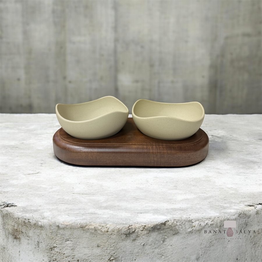قاعدة خشب أكاسيا مع صحنين حجر صغار