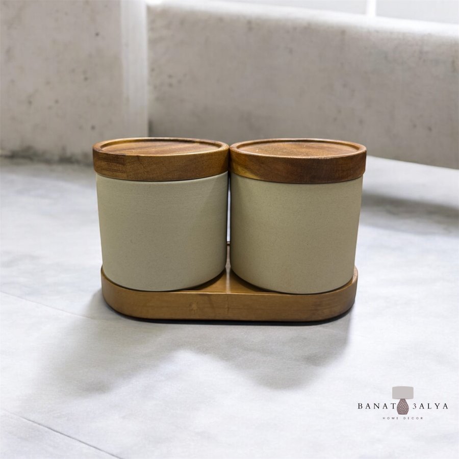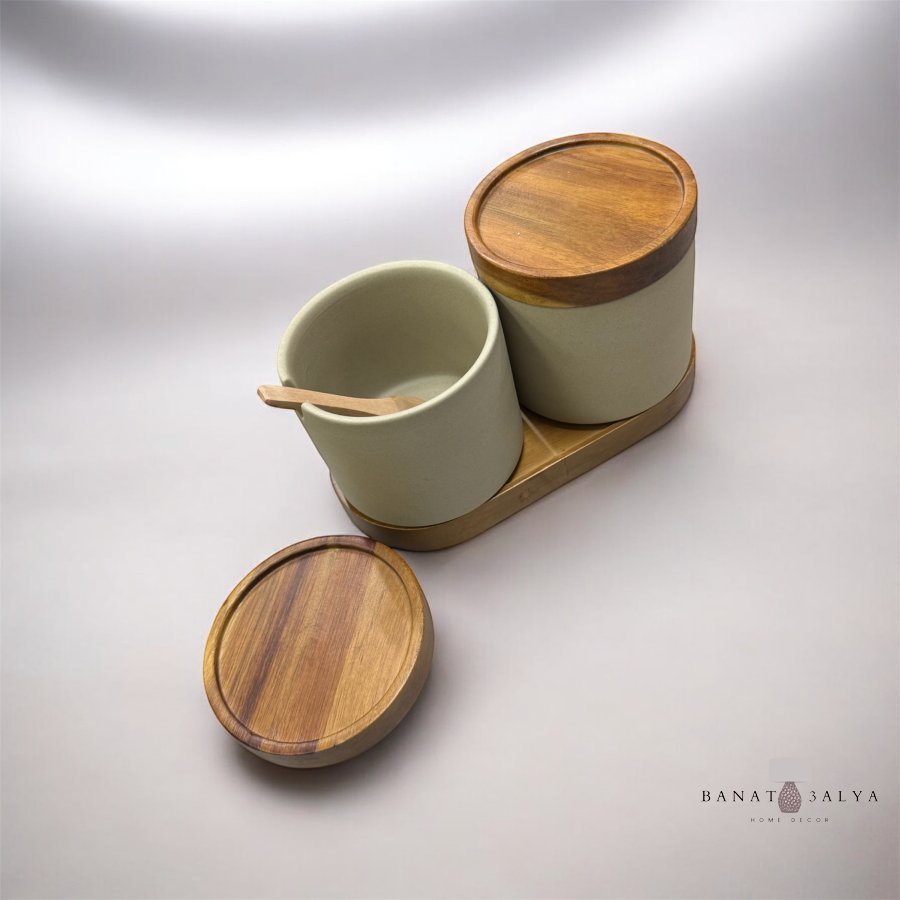 طقم سكريات حجر مع خشب الأكاسيا مع إضافة الملاعق