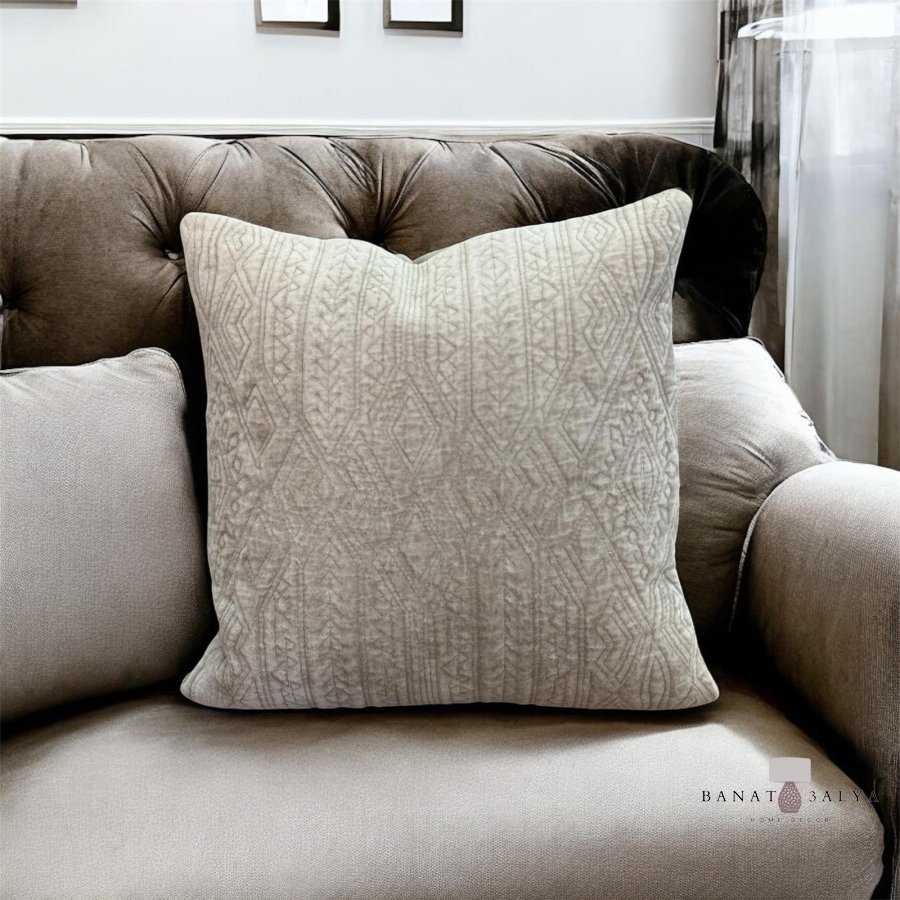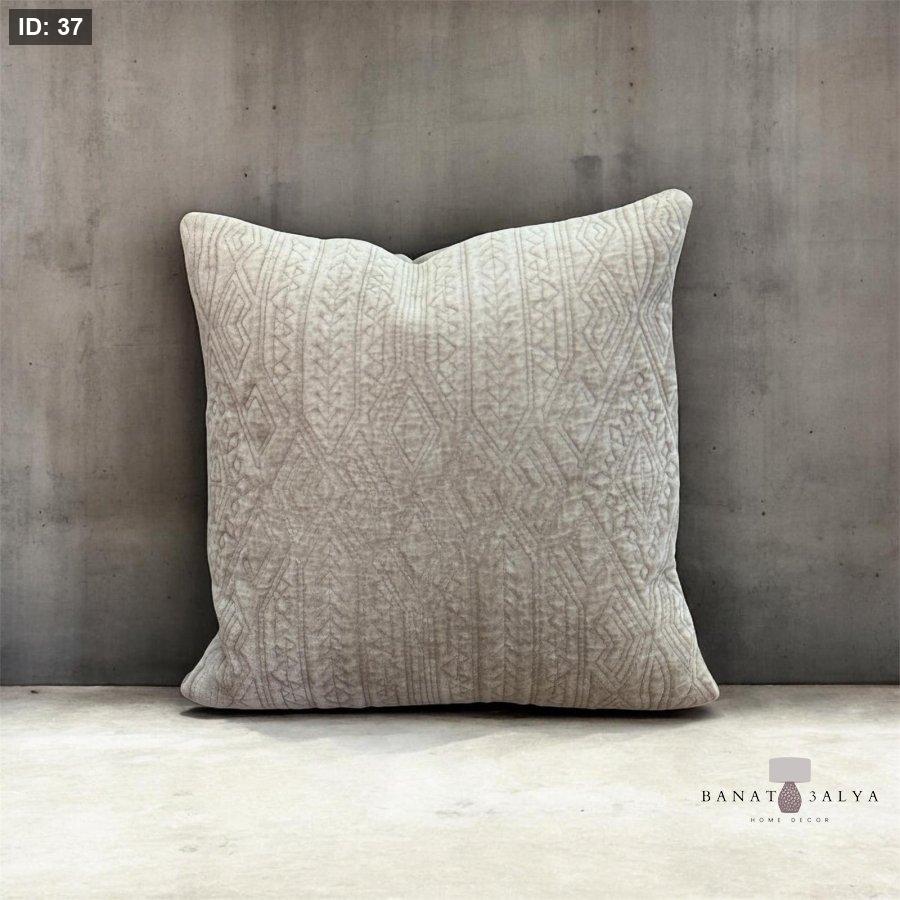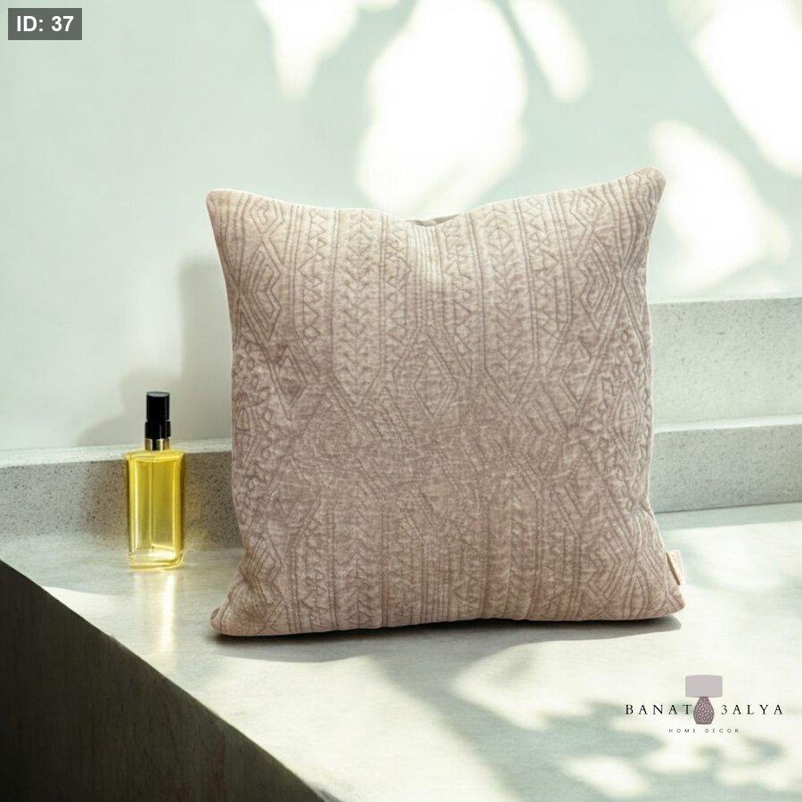 • مخدة ديكور مربعة بلون بيج هادئ ونقشة بارزة أنيقة.
