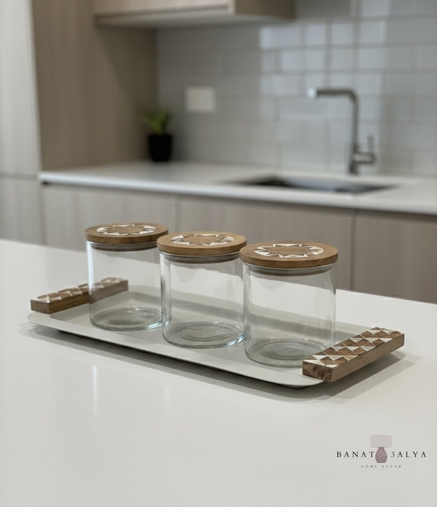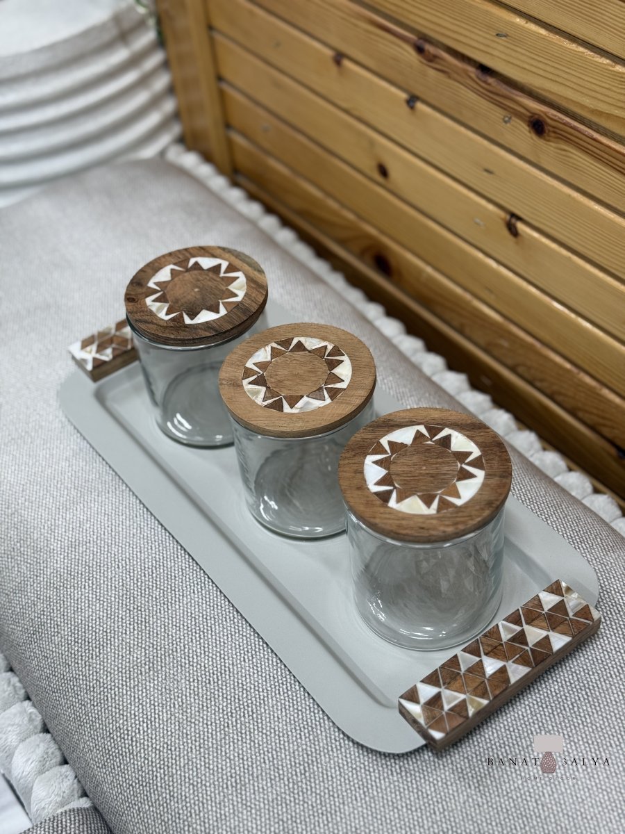 جاط معدن بإضافة ايدين خشبية مع ثلاث علب زجاج بأغطية خشبية