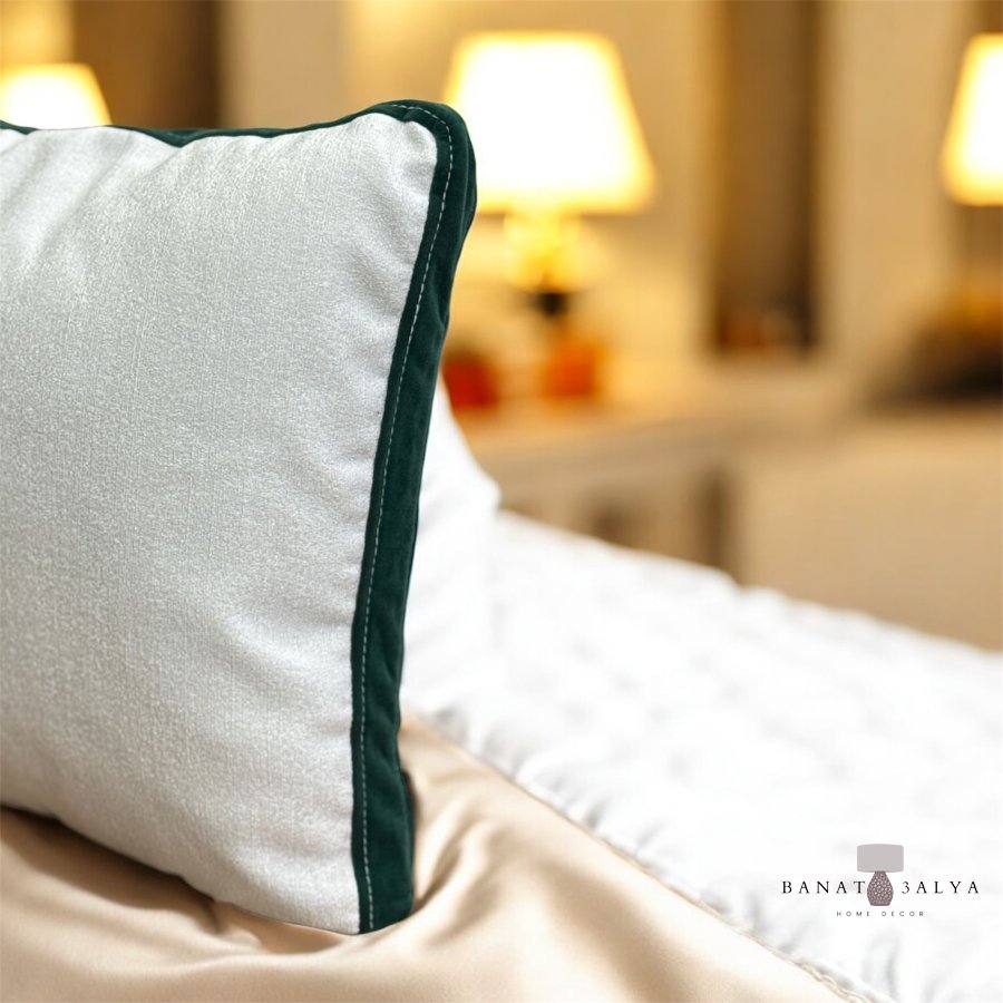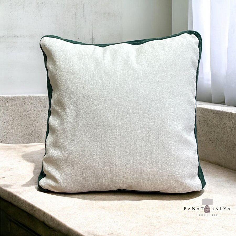 مخدة بقماش ناعم ومميز باللون الأبيض مع إطار باللون الأخضر المميز .